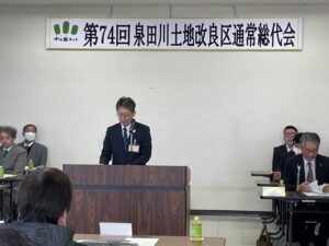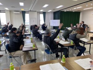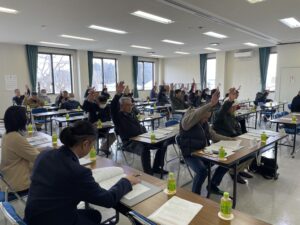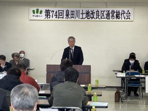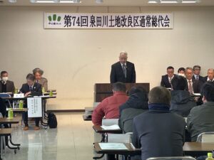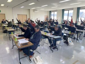 第74回通常総代会は、令和8年3月10日(火)午前10時より萩野地区公民館に於いて開催されました。総代現員数40名中29名が出席され、来賓に最上総合支庁産業経済部農村計画課の坂井正志課長をお迎えして祝辞をいただきました。議長に赤坂地区の阿部欽也総代が選出され、令和8年度各会計予算を始めとした承認2件、議案10件が原案どおり可決承認されました。